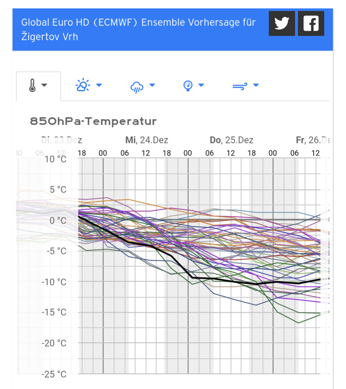 Se pa nakazuje na spremembo v nedeljo zvečer oz. V ponedeljek zjutraj, ko bodo temperature spet pod ničlo na vrhu Pohorja. Ampak še zaenkrat kaže na temperature, ki ne omogočajo zasneževanja oz. Celo postaja z vsako napovedjo malce topleje, saj se zamika ohladitev vvteden.. Tam okoli božiča pa bolj mrzlo in celo kaj sneženega... Kaže celo do 50mm padavin. Bomo videli.