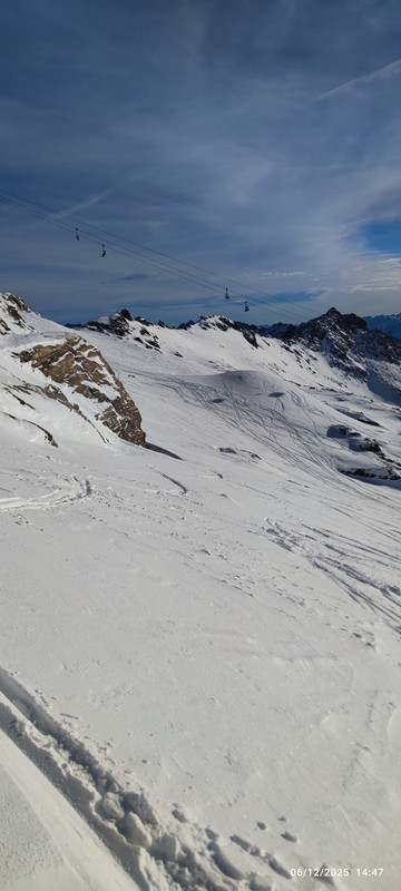 Danes čudovito, za desetko. Ob 9.50 sem brez težav parkiral na strehi, potem pa ujel vlakec ob 10.00. Odprte so bolj ali manj vse pomembnejše proge, samo direktno s šestsede dol v luknjo proti Panorami in Altecku še zasnežujejo (videti je že precej blizu). No, pa Schwarzkopf seveda ne obratuje. Sneg je bil do treh, ko sem zaključil, bolj ali manj perfekten - suh, zimski, nič betona. Karvanje po modri proti spodnji postaji kabinke je bilo sanjsko, prav tako spodnja strmina zraven Panoramabahna.