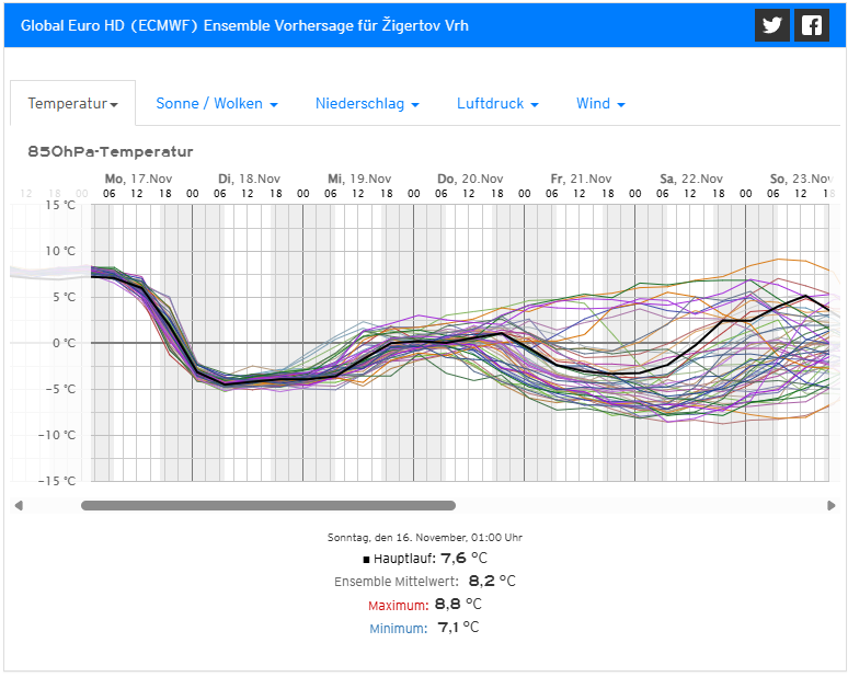 Napoved pa že postaja luštna. V ponedeljek zvečer se prične hladiti, ampak do kakšne cifre bo šla ohladitev, pa je še malce nejasno. Zaenkrat kaže na okoli -5°C na 1500m ploskvi in malo otoplitev v sredo, nato pa modeli pričnejo tako zelo skakati gor in dol, da je prehitro govoriti za karkoli. Bodo pa najvišja smučišča lahko že pričela zasneževati.