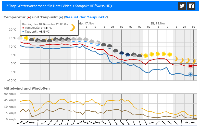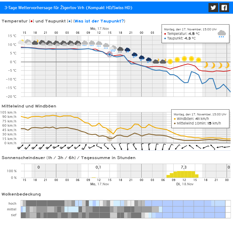 Pogled za tri dni za Žigartov vrh. Lepo vidimo kar nekaj padavin jutri, ki se zvečer obrnejo v sneg, padlo ga bo cca. 5 cm, toliko za vzorec. Za v torek vidimo osušitev in razjasnitev. Predvsem na račun nizke vlage bo mogoče zasneževanje najverjetneje po celotni progi, tam kjer topovi stojijo.