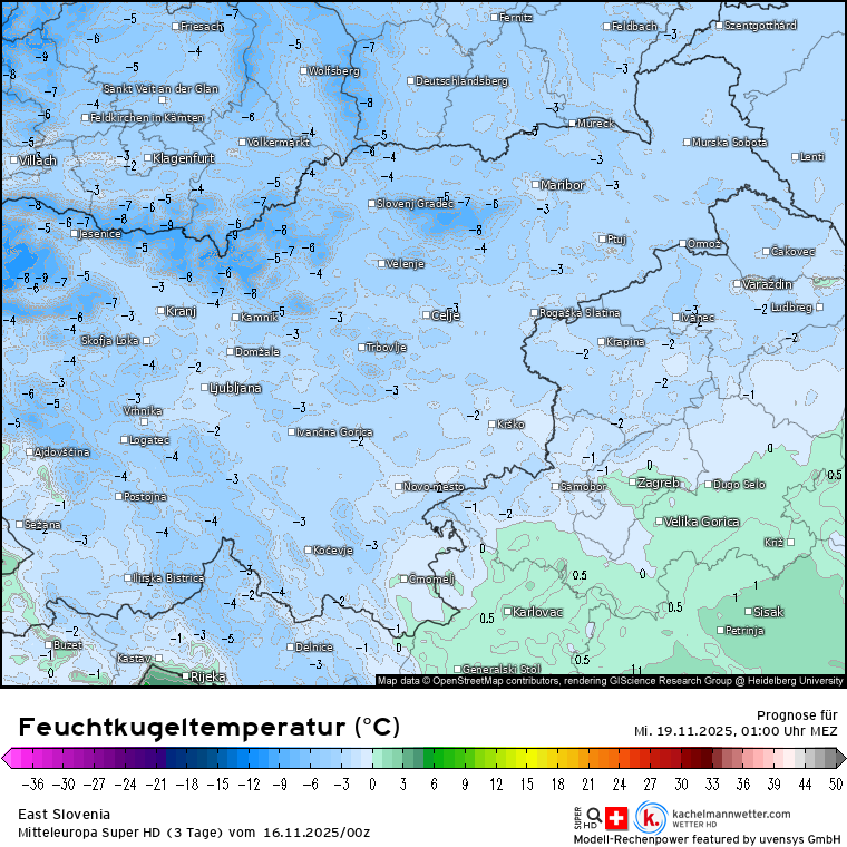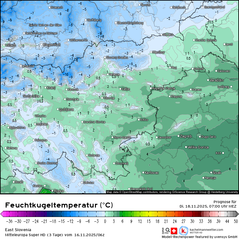 Karta vlažne temperature po večjem delu Slovenije za torek zjutraj, ko bodo lahko najverjetneje pognali prve topove. Vse je odvisno od tega, kako hitro se bo megla razkadila po hribu. Zdaj je že opazna tendenca, da ohladi se nekako po planu, osuši pa se par ur kasneje kot po napovedi, saj skoraj zmeraj okoli vrhov hribov ostane po hladni fronti kapa oblakov, čeprav je zrak okoli že precej suh. Vse je odvisno od intenzitete severnega vetra, ki bo tokrat bolj blag.