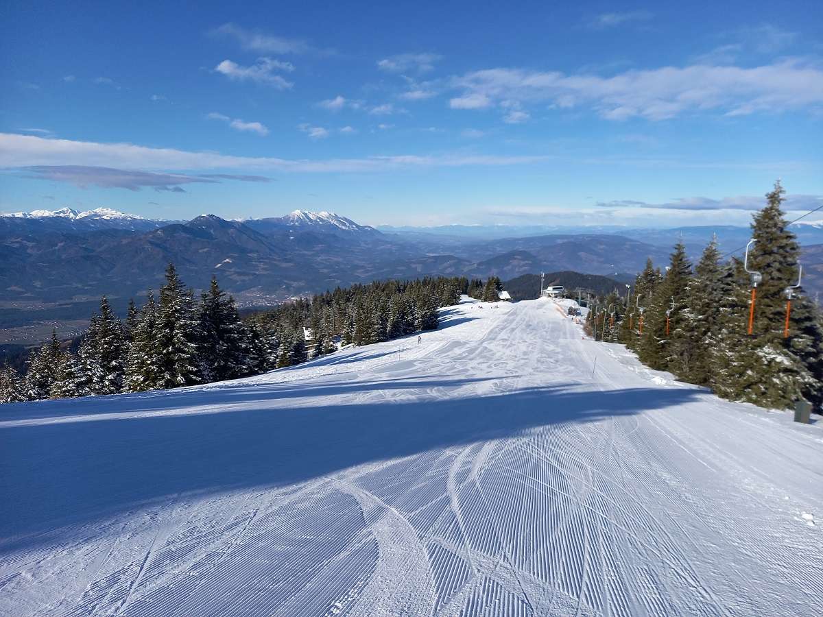 Kratko poročilo s Kop: danes odlična smuka in perfektno porabljen dan dopusta (ob ceni dnevne vozovnice z malico 19,90 EUR bi več dal za bencin do najbližjega smučišča SSC, predvsem pa je bilo danes enkrat izjemoma pri nas lepše vreme kot S od Alp). Nori razgledi, sploh na J se je videlo vse do Snežnika: