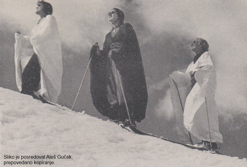 Vzpon smučarjev peš s smučmi na nogah s Thirringovimi plašči (1938).