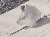 Smučar v nizkim preži z razprostrtim netopirskim plaščem na težkem snegu – boljše ravnotežje kot brez plašča (1938).