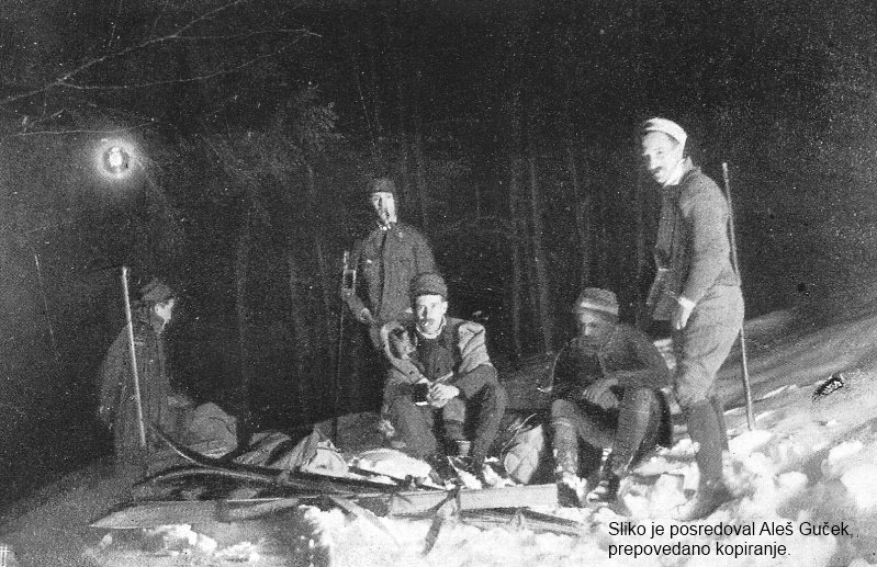 Slovenska turno smučarska druščina na poti s Križke planine (tednik SPORT leta 1920).