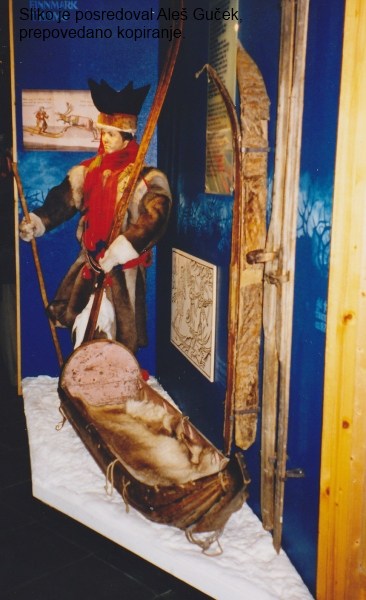 Vhod v smučarski muzej na Holmenkollnu leta 1998. Za svetovno prvenstvo v nordijskih disciplinah konec februarja 2011 so spremenili okolico in tudi muzej. |  Razglednica Smučarskega muzeja v Oslu leta 1950, ko so bile še razstavljene bloške smuči. Direktor muzeja je bil Jakob Vaage, ki je zelo dobro poznal tudi bloško smučanje. |  Stare smuči iz osrednje Norveške. |  Smučarske palice različnih obdobij. |  Južni tip starih smuči iz okoli 1500 po našem štetju. |  Lesena krpljica iz 19. stoletja. |  Žličkasti vrh smučarske palice, ki je z obrnjeno palico, da je bila konica zgoraj, koristil v mehkem snegu za odrivanje smučarja naprej, kot bi veslal po snegu (19. stoletje). |  Predstavnik laponskega plemena Sami z visokega severa Norveške. Živijo še na Finskem in Švedskem. |  Avtor prispevka s ponosom drži v rokah originalno smučko Fridtjofa Nensena, s katero je leta 1888 prečil s spremljevalci otok Grenlandijo in sprožil zanimanje za smučanje v srednji in južni Evropi. |  Nansen je zgradil leta 1888 zasilno plovilo iz ostankov opreme svoje odprave preko Grenlandije, ko je prišel na zahodno obalo otoka. S spremljevalcem sta veslala in jadrala na jug do prvega ribiškega zaselka in poslala pomoč za povratek svojih treh prijateljev, ki so čakali na zahodni obali. |  Obrtna delavnica znanih norveških muči iz ameriškega lesa hikori (orig.: hickory), ki ga je lahko uvažala za Evropo le Norveška in les z »dodano vrednostjo« v obliki smuči drago prodajala v tujino. |  Usnjeno norveško streme in smučarski čevelj iz okoli 1890. |  Skakalne smuči z vezmi in čevljem iz okoli 1965. |  Prepogljive in zložljive krpljice, ko je smučar povezal skupaj smučarski palici (okoli 1930). | |