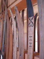 Vsebina članka je avtorsko delo. Prepovedano je kopiranje članka brez dovoljenja avtorja. Stranska fasada muzeja. |  Krplje so predhodnice smuči. |  Pozimi so lovci na smučeh plenili divjad. |  Najstarejša na Švedskem najdena smučka naj bi bila iz 5200 let pred našim štetjem. |  Na starejši muzejski zgibanki je smučka iz Kalvträska, ki so jo našli leta 1924 v tem kraju in je veljala dolgo za najstarejšo odkrito smučko. Nato so našli v Rusiji iz okoli 5000 do 7000 pred našim štetjem izdelano smučko. |  Prikaz idealnega drevesa in delov debla, primernega za izdelavo smuči. |  Smučke so Laponci ovijali v živalske kože, da se sneg ni preveč oprijemal drsne ploskve, poleg tega so nazaj zasukane dlake pomagale pri odrivanju naprej in za vzpone na manjše, ne preveč strme griče. |  V 19. stoletju so Laponci razvili posebno umetnost dekoracije smuči, čeprav so jih rezljali in okraševali že prej, a to obdobje vendarle velja za novo »smer umetnosti«. |  Krivina ljudske enostavne smučke. Prečne zareze v krivini so omogočile lažje krivljenje, saj so izdelovalci presekali vzdolžne letnice. Ker so se krivine preko poletja ali pozimi, ko so jih sušili, mokre od snega, se je krivina večkrat zravnala. Žica naj bi preprečila tovrstne deformacije. |  Različni primerki prednjih delov smuči. |  Navadno je bilo cevno streme iz konca 19. stoletja narejeno iz ene debelejše šibe. Redek primer dvojnega cevnega stremena. |  Ljudski smučarski kolci so bili na vrhu oblikovani v vrste žlice ali opremljeni z rogom severnega jelena. Na spodnjem koncu je bil količek opremljen s kovinsko konico. Ta je bila primerna za oporo v tršem snegu. V mehkejšem globokem snegu so Laponci kolec obrnili in z žličko ali rogom »veslali« po snegu. |  To ni čokoladna masa za izdelavo tort, temveč mešanica smučarskih maž. V začetku 20. stoletja so bile glavne sestavine maž katran, parafin in drevesne smole, potem še skrivnostne, tajne sestavine, ki so jih smučarji zvarili skupaj, da bi smučke na tekmovanjih hitreje drsele. |  Levo iz okoli 1950. leta vrstična tekaška kotalka s tekaško vezjo Rottefella za trening po suhem. Desno novejši izdelki. |  Bror With je leta 1928 patentiral tekaško vez. Tovarna Rottefella proizvaja te še danes in poleg tekaških vezi še vezi za skakalne smuči (na sliki) in za novodobno telemark smučanje. | | |