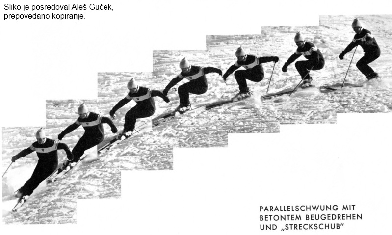 Osnovni položaj tehnike nasprotnega sukanja ramen in položaj smučarja ob vbodu palice. |  Slovenski učitelj smučanja Janez Šuster, ki je bil leta 1953 v Kruckenhauserjevei šoli smučanja v St. Christophu na Arlbergu je leta 1956 prikazal vrhunski položaj med paralelnim zavojem. |  Graduated Length Method – GLM (metoda poučevanja s podaljševanje smuči), ki si jo je izmislil leta 1955 Clif Taylor (prva objava v članku) je zadovoljevala ne preveč ambiciozne smučarje, ki so vendarle smučali po manj zahtevnih smučarskih progah. Na sliki Clif Taylor na kratkih smučeh v odročenju zaradi boljšega ravnotežja. |