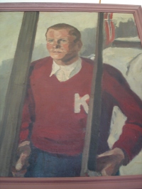Slikarski portret Sigmunda Ruuda, ki je oblečen v klubski rdeč pulover z znakom K, kar je pomenilo Kongsberg, oziroma Smučarski klub Kongsberg (okoli 1936).