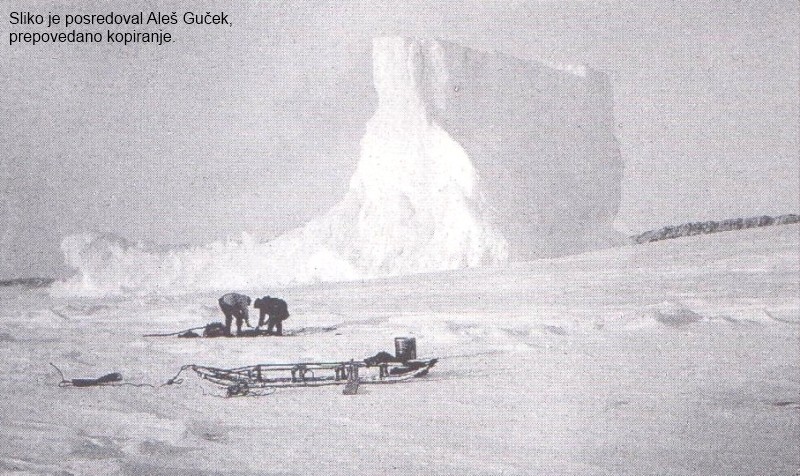 upokojeni arhitekt in (m)učitelj smučanja Morski raziskovalci so se od 16. stoletja naprej odpravili v severna evropska morja in se vračali domov z zgodbami o Eskimih, plemenu, ki je živelo pozimi v ledenih pokrajinah in le kratkem času poleti videli malo zelene zemlje. Preživljali so se z lovom in ribolovom. |  Iskanje severozahodnega morskega prehoda za pot v Indijo jih je toliko obremenjevala, da so nemalokrat zašli v velike težave, ko jim je led oklenil lesene ladje z jadri in so našli, kar so trmasto izzivali - belo smrt. Martin Frobisher se je leta 1576 pri iskanju severne poti na Kitajsko celo spopadel z Eskimi, ki so bili sicer miroljubni do tujcev, saj so se zavedali, da si je treba pomagati v težkem življenjskem okolju. |  Nizozemski kapitan Willem Barents se je prepozno vrnil v tople kraje iz potovanja leta 1596 in se je nenadoma znašel z ladjo v ledenem oklepu. Ni se ga mogel rešiti in ta mu je zaradi širjenja zdrobil ladjo. Pozno spomladi so iz ostankov naredili čolne in se vrnili nazaj, vendar brez kapitana, ki je pozimi umrl v 61. letu starosti. |  Grafični prikaz nevarne plovbe med ledenimi gorami, ledenimi ploščami in ozkimi prehodi med visokim ledom. Polarni raziskovalci so morali z ladjami so morali doseči ledeno kopno Arktike in Antarktike ter nekaterih otokov, kot na primer Grenlanda, da so lahko nadaljevali pot na smučeh in s pasjimi vpregami v notranjost belih puščav. |  Na Antarktiki jih je pestil mraz, vetrovi, snežni viharji, medtem ko so na Arktiki na njih prežali še beli medvedje, vdirali v taborišča, ki so jih postavili med potjo, pobijali vlečne pse, napadali ljudi in tudi skušali ugrabiti njihove zaloge hrane. Ni jih zaustavilo niti vpitje, rožljanje s kuhinjskimi posodami, le streli iz pušk so jih preplašili, da so ušli. Znani so primeri, ko je ladijska posadka pozimi preživela na ladji sredi ledu, da je medved splezal na krov in tolkel po vratih in oknih, dokler se ni kdo ojunačil in stopil na plano in ga pregnal s strelom iz puške. Nekatere nadležneže so morali celo pokončati. |  Ladjo, ki je bila vklenjena v led, so mornarji reševali tako, da so okoli in okoli nje s sekirami in krampi naredili široke vodene jarke, da led ni zdrobil krhkih ladij. To delo je bila stalnica, saj je morje hitro zamrzovalo nazaj. Na sliki ladja Fram, ki je danes razstavljena v muzeju v Oslu. |  Polarni raziskovalci so odeli v debele kožuhe in toplo obutev, da so preživeli tako zimo kot poletje, ki zaradi toplega obdobja ni bilo nič kaj prijazno, temveč bičalo z vsemi hladnimi »dobrotami«. |  Otok Grenland je zanimal tako Dansko, Švedsko in Norveško. Na jugozahodnem delu so kitolovci okoli 1880 postavili ribiško naselje Godthaab in se pozimi v okolici zabavali s smučanjem. Tekmovali so tudi v »štehvanju« na smučeh (podobno saveljskemu pri Ljubljani, ko mladeniči z lesenimi kiji na drvečih konjih skušajo razbiti sode). |  Norvežan Fridtjof Nansen se je iz Bergna preselil v Kristianijo (današnje Oslo) in začel sanjariti o polarnih odpravah. Hotel je leta 188 prečiti otok Grenland, kar mu je s spremljevalci tudi uspelo. Prečenje na smučeh je imelo velik odmev v svetu, tako da se je smučanje iz Norveške preselili tudi v srednjo in južno Evropo (Fridtjof Nansen, Polarni muzej, Tromsø, Norveška). |  Fridtjof Nansen pred začetkom pohoda preko otoka Grenland. |  Fridtjof Nansen se je leta 1896 odpravil proti Severnemu tečaju, ki pa ga ni nikoli dosegel |  Ameriški The Graphic Weekly Newspaper je objavil sliko srečanja leta 1896 na Cape Flora, Zemlja Franca Jožefa med Fridtjofom Nansenom in prav tako polarnim raziskovalcem iz Anglije Frederickom Jacksonom. Res sta se srečala, pri čemer je bil Jackson ponosen, da je osebno spoznal Nansena. Slednji (na desni) pa prav nič preveč, saj je bilo ljubosumje in konkurenca med polarnimi raziskovalci huda in so se raje izognili drug drugemu,m kot da bi izmenjali izkušnje v prijateljskem pogovoru. Bile so tudi redke izjeme, a res zelo redke, pa še te v tistih letih, ko niso več mogli na odprave. |  Polarne odprave so se v začetku 20. Stoletja izkrcale z ladij v polarnih raziskovalnih postajah, tam zložili prtljago, vso opremo, vlečne sani s sanicami, pogosto narejenih iz smučk, se spočili od dolge in nevarne plovbe z ladjami in se pripravili na pohod, največkrat v neznane bele širjave in hribe notranjosti belih celin. |  Polarne smuči so bile bolj vzdržljive in krajše od običajnih norveških telemark smuči, da so bile bolj okretne. Drsno oblogo so včasih obložili s tanko pločevino, da se les ni prehitro obrabil zaradi drsenja po ledu. Usnjeno streme, ki se je namočilo, pa zopet zmrznilo, je bilo preveč togo in se je pogosto strgalo. Zato so polarni raziskovalci raje namestili po letu 1900 kovinsko čeljust Norvežana Fritza Huitfeldta (Polarni muzej, Tromsø, Norveška). |  Stremena iz usnje ali iz vrvi polarnih odprav pred 1900. Lesena podložna plošča je bila pritrjena pod stopala, da so smučko še bolj utrdili(Polarni muzej, Tromsø, Norveška). |  Huitfeldtova vez s kovinsko čeljustjo, patent iz leta 1896, ki so jo namestili v ravnem stanju skozi režo podložne plošče in nato stranici zakrivili, da so namestili v čeljust čevelj, ki se ni mogel premikati levo in desno (Polarni muzej, Tromsø, Norveška). |  Danes izdelujejo posebne vezi za polarne smuči iz plastike, ki je odporna tako na višje kot zelo nizke temperature, v hudem mrazu ne otrdi in poči. Lažje so od kovinskih in lažje prilagodljive različnim vrstam čevljev za pohod po belih puščavah. Na sliki vez polarne rusko-kanadske odprave, ki je dosegla Severni tečaj. |  Dva izmed najbolj znanih pohodnikov po belih celinah, zlasti po boju leta 1911 za prvenstveno osvojitev Južnega tečaja: Norvežan Roald Amundsen (levo) in Anglež Robert Falcon Scott. Oba sta dosegla cilj, Norvežan pred Angležem, katerega vsi člani odprave so umrli, sam zadnji. |  Scottova odprava leta 1