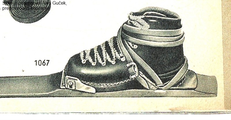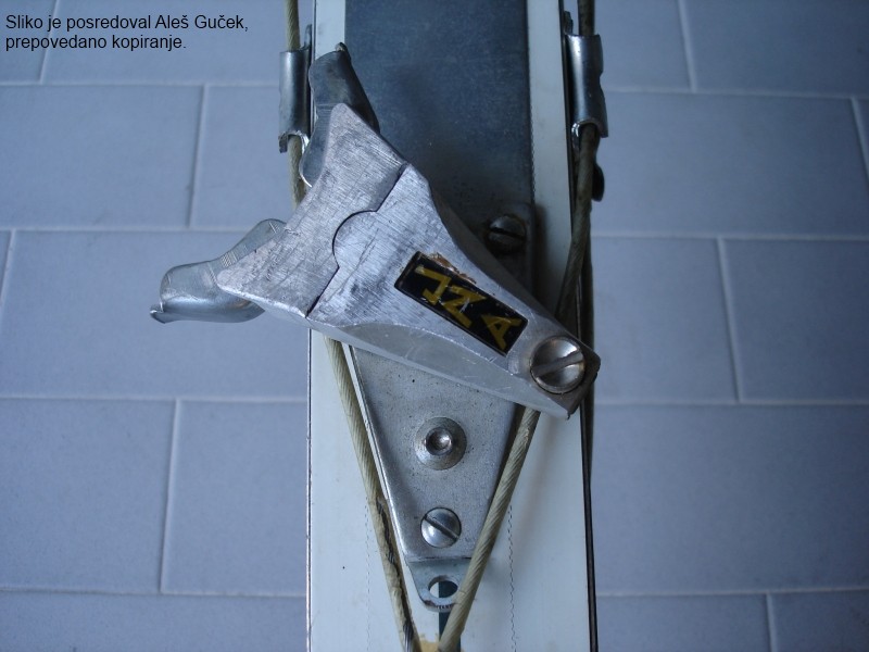 Enovrstičan tekaška kotalka (pogovorno: rolka) z Roattafello vezjo iz okoli 1950, težka 8 kg za tek po asfaltu med poletnim treningom smučarskih tekačev. |  Zgoraj alpska aerodinamična krpljica na palici za smuk in super veleslalom in spodaj krpljica na palici za tek na smučeh. |  Doma narejena smučka in usnjeno streme iz Bovca iz okoli leta 1950. Na teh smučeh je Bovčan, star skoraj 80 let, nastopal na prireditvah smučarjev po starem. |