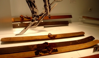 Takoj za vhodom se košatijo številni pokali. Na sliki kristalna globusa biatloncev. |  Kristalni »vodni stolp«, ki ga mora nositi več smučarjev zaradi velike teže. |  Primer neke vrste okorne sibirske »smučke«, ki je služila za hojo po močvirjih in po zasneženi močvirnati brozgi. |