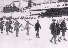St. Moritz je bil organizator prvih povojnih olimpijskih iger, na katerih niso smeli nastopiti zaradi udeležbe v vojni Avstrijci in Nemci. Demonstracijsko so izvedli zimski peteroboj: tek na 10km, streljanje s pištolo, sabljanje z mečem in jahanje, ki je bil podoben poletnemu peteroboju, če ne bi bilo teka, bi pa bilo plavanje. Torej bolj ali manj vojaško usmerjene športne discipline.  Plakat iz leta 1928. |  Jugoslovanska ekipa s samimi Slovenci med otvoritveno parado. Stanko Bloudek je spredaj desno. |  Moštvo leta 1928 v tekih (z leve): Stanko Kmet, Joško Janša, Janko Janša (črn kot »biks«), ker je bil stalno na snegu na soncu, trener iz Norveške inž.Tunold Thorleif Hanssen, Stane Bervar – Nani in Boris Režek. |  Plakat 1948. |  Češkoslovaško smučarsko moštvo na olimpijskih igrah 1928 v St. Moritzu. |  Jugoslovansko olimpijsko moštvo s samimi Slovenci med otvoritvijo leta 1948, St. Moritz, Švica. Zastavo nosi odlični alpski tekmovalec Tine Mulej. |  Patruljni tek ni bil na sporedu leta 1948, zato so ga izvedli kot demonstracijsko disciplino. Na sliki Švicarji. |  Švicar Karl Molitor med slalomom leta 1948 v St. Moritzu. Molitor je po končani tekmovalni karieri izdeloval odlične alpske tekmovalne čevlje, ki so bili za razliko od drugih iz usnja rjave barve. |  Šved Nils Karlsson je leta 1948 zmagal v teku na 50 km. Zmagoval je od leta 1943 do leta 1953 na znamenitem 90 km dolgem Vasaloppetu in dobil nadimek »Nisse-Mora«. Mora je kraj, kjer je še danes cilj tega množičnega teka. |  Levo zgoraj je zlata kolajna Karlssona iz leta 1948 in številna druga priznanja, ki jih je prejel za tekmovalne uspehe. | | |