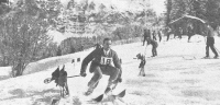 Najboljši slovenski alpski smučar takoj po 2. svetovni vojni Tine Mulej med treningom slaloma pred jugoslovanskim državnim prvenstvom na Kopaoniku v Srbiji leta 1949. Značilni Mulejev odklon in nizka slalom preža.