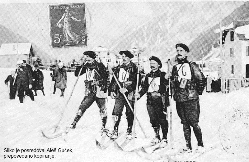 Francija ne bi bila Francija, če ne bi kmalu pozimi povabila v svoje smučarske kraje turiste s posebnim smučarsko modnim plakatom in kot se za deželo spodobi, na njem ni manjkala simpatična »mademoiselle«. Plakat ni bil dovolj, zato so še hotele in tujske sobe opremili s centralno kurjavo. Po vzoru svetovnih razstav so v letu 1907 v Montgenėvru v Franciji organizirali smučarsko razstavo in storili korak naprej: smučarka je že nosila kombinacijo pod koleni spodrecanega krila, ki je bil podoben »balonskim« pumparicam. Spodnji del je že spominjal na moške smučarskem hlače. Dopust v Alpah je spremljala misel: «Mraz nas kali, vendar da na pašo naše utrujene živce vsled pariškega življenja.«