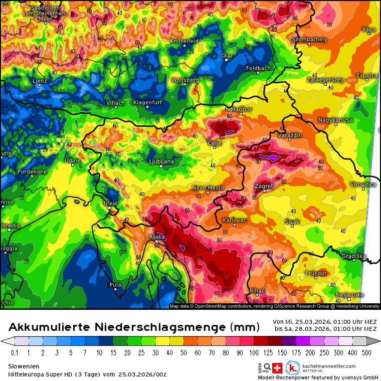 Super HD pa kaže padavinsko bombo jutri in v petek. O višinah pa naj več povesta naslednji sliki.