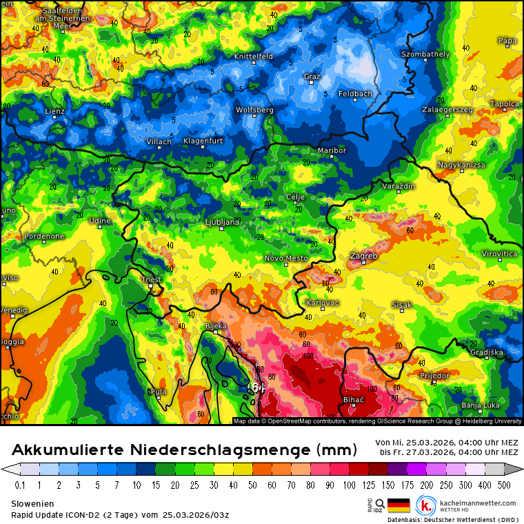 Rapid, bolj padavinsko skop, padavine se selijo na jug, seže le do četrtkovega popoldneva.