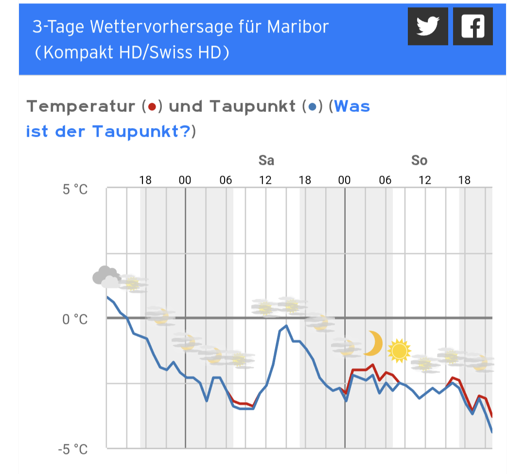 Temperature v Mariboru, ki so ravno na meji za zasneževanje. Upam da presenetijo.